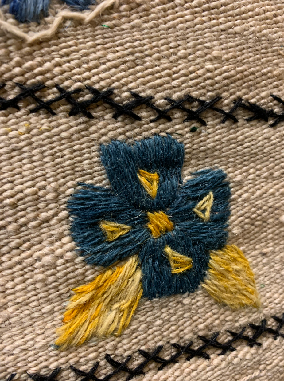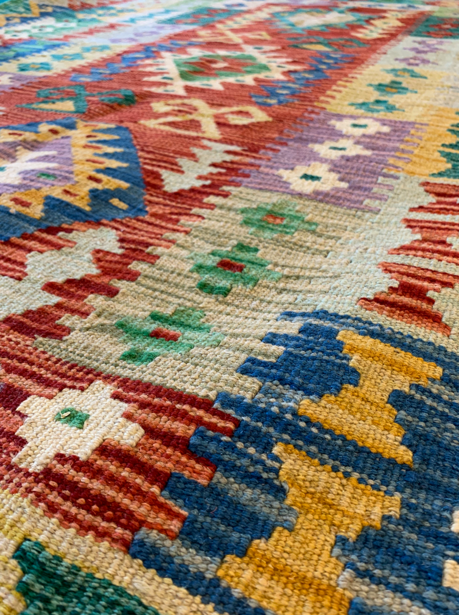 Another favourite of ours here at our carpet shop in Kidderminster is this unique Suzani Kilim rug – it would look great in a beautiful country-style home. This design is handwoven and embroidered, and takes inspiration from Suzani designs dating back to the 18th century. Traditionally, Suzani are embroidered tribal textiles made in central Asian countries. We not only love its colours and unique design, but also its versatility; you could use it as a wall hanging, throw, or rug.
